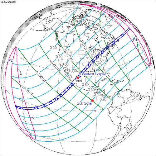 It turns out 223 synodic months, 242 draconic months, and 239 anomalistic months are all nearly equal to 18 years, 10 - 12 days (depending on number of leap years in between), and 8 hours. We call this length of time a saros. This means that we can expect another total solar eclipse one saros later, on April 20, 2042. The only catch is that the extra 8 hours means the path of the eclipse will land about 120° west of where it will in 2024. This is easy enough to account for however and explains how future eclipse events can be predicted based on previous eclipse observations. Of course, nowadays, we use computers to very carefully forecast the dynamics of the Sun-Earth-Moon system and generate highly accurate predictions.