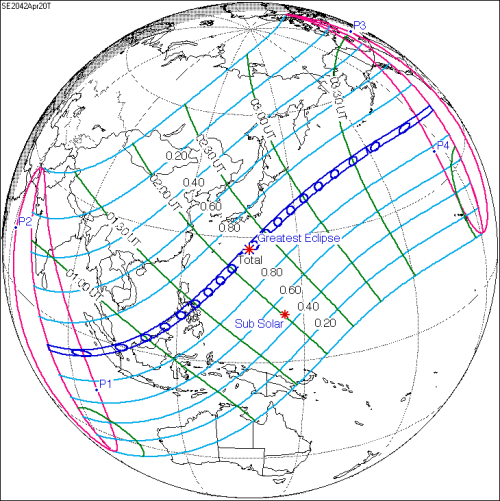 Figure 2: The April 8, 2024 solar eclipse path (left) compared to the April 20, 2042 solar eclipse path (right) which will occur one saros later.