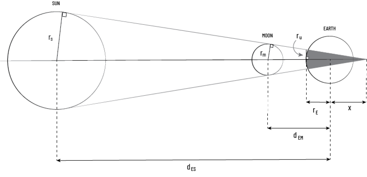 Let rS be the radius of the Sun, \(r_{M}\) be the radius of the Moon, \(r_{E}\) be the radius of the Earth, \(d_{ES}\) be the Earth-Sun orbital separation distance, \(d_{EM}\) be the Earth-Moon orbital separation distance, \(r_{U}\) be the radius of the umbral shadow, and \(x\) be the distance from the centre of the Earth to the vertex where the umbra meets the antumbra.