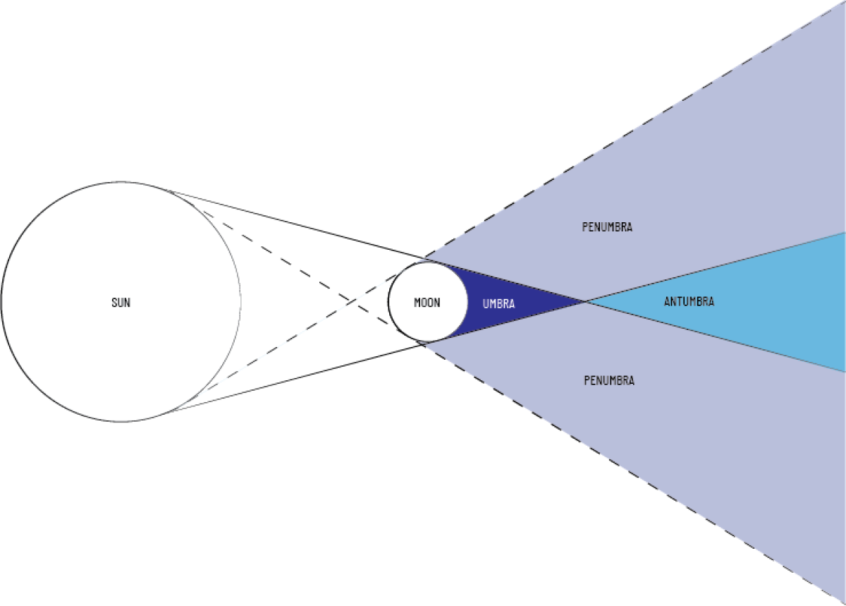 Let's note two other regions of interest. First, if you are in the conical region on the other side of the vertex which we call the antumbra, then you'll be able to see the rays of light tangent to the Sun and the Moon. However, you still have the Moon between you and some portion of the Sun. This means you're in a region where you'd observe an annular (ring-shaped) eclipse. Second, notice that there is a region which we call the penumbra in which the Sun will be partially obscured including some part of its edge. In this region, you'll observe a partial eclipse.